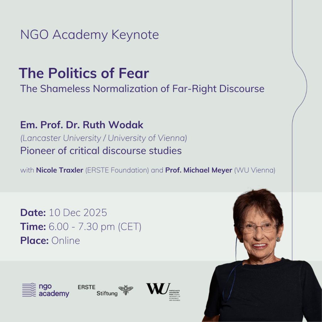 Prof. Dr. Ruth Wodak untersucht das Phänomen der „schamlosen Normalisierung“: ein Prozess, bei dem Provokation, Leugnung und Verschwörungstheorien nicht nur toleriert, sondern von politischen Akteuren strategisch eingesetzt werden, um die Grenzen des Aussagenbaren zu verschieben.